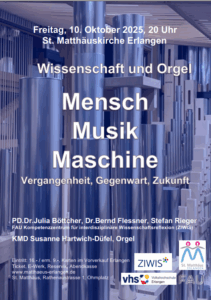 Angefangen mit einem erfolgreichen Nicolaus-Copernicus-Symposium zum wichtigen Thema „Grenzen des Wissens“, gemeinsam veranstaltet mit dem Planetarium der Stadt Nürnberg, über unser langjähriges Kooperationsformat „Zukunftsplausch“ mit dem Deutschen Museum Nürnberg und die Veranstaltung „Wissenschaft und Orgel: Mensch – Musik – Maschine“ (PD Dr. Julia Böttcher, Dr. Bernd Flessner, Stefan Rieger) bis hin zur „Langen Nacht der Wissenschaften“ mit weit über 1600 BesucherInnen bei unseren Angeboten in Erlangen und im Deutschen Museum Nürnberg. Das FAU ZIWIS ist mit seinen Themen in der Öffentlichkeit weithin sichtbar und im intensiven Gesellschaftsdialog zu Wissenschaftsreflexion und Schlüsselqualifikationen.