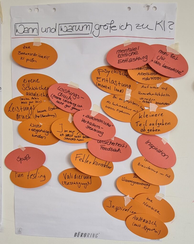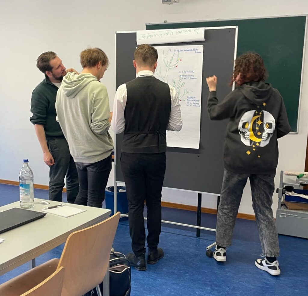 Nach einer Einführung durch Online-Module mit begleitendem Tutorium trafen sich die Teilnehmenden zu einem Blockseminar, in dem externe Expertinnen und Experten Impulse zu gesellschaftlichen und fachlichen Aspekten der KI-Nutzung gaben. Diese Themen wurden in Kleingruppen vertieft und diskutiert. Ein besonderes Highlight war die individuelle Reflexion im angeleiteten Coaching: Die Studierenden erarbeiteten ihren persönlichen Umgang mit KI für Studium und Beruf.